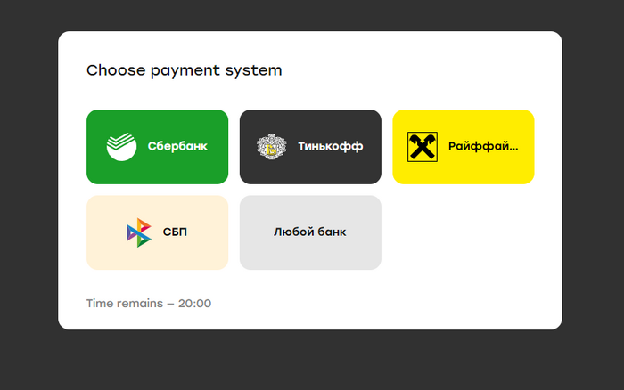 Выбираешь банк, а далее, как я описал, переводишь через приложение банка, в окне транзакции жмешь, что перевел, и ждешь зачисления.