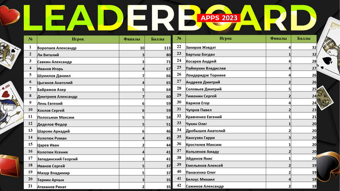 На втором месте с отставанием в 33 балла Виталий Ли. Чтобы догнать лидера, нужно затащить один из дорогих турниров: Мейн Ивент или Хайроллеров. Третье место у Савкина Александра. Замыкает десятку призеров Сергей Хохлов.