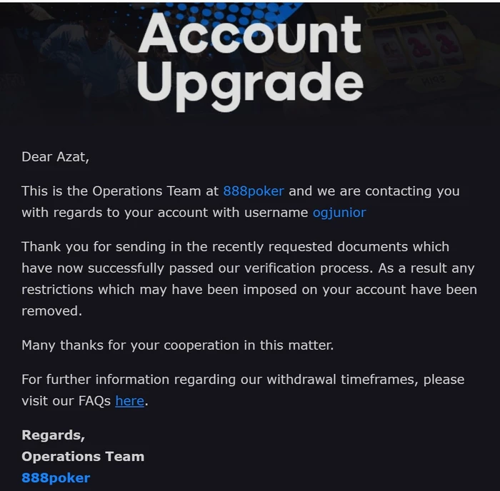 Здравствуйте. Пару месяцев назад мне заблокировали аккаунт на 888 по непонятной причине. Затем через лайв чат я узнал, что мне было отправлено письмо на почту в вопросом о переводе средств конкретному игроку, хотя самого письма мне на почту не приходило. Я им ответил что деньги переводил другу на игру. Они запросили документы, я им всё отправил и получил письмо что все документы подтверждены, но акк так и не разблокировали. Я еще раз им написал, чтобы узнать что не так и когда я смогу вывести средства. Прошло уже больше 2-х недель с момента последнего обращения к ним, но они мне так и не отвечают и не дают вывести деньги. Сейчас у меня на счету заморожены 8718$ . Мой ник на 888 ogjunior . Это большая сумма для меня и надеюсь этот вопрос решится в положительном ключе.