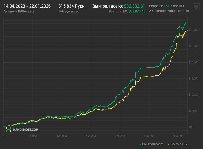 Провел в апреле-мае 2025 года марафон "Подъем с микролимитов". Была цель осуществить буст банкролла с 50$ до 1000$ в кратчайшие сроки. Сессии в рамках челленджа были отыграны на стримах 📈. Марафон занял 147 часов игры и 34к раздач. Итоговый винрейт 18бб/100.