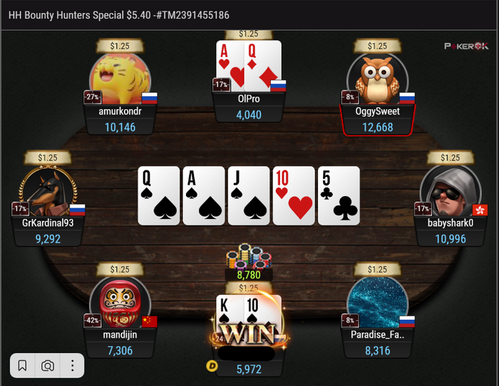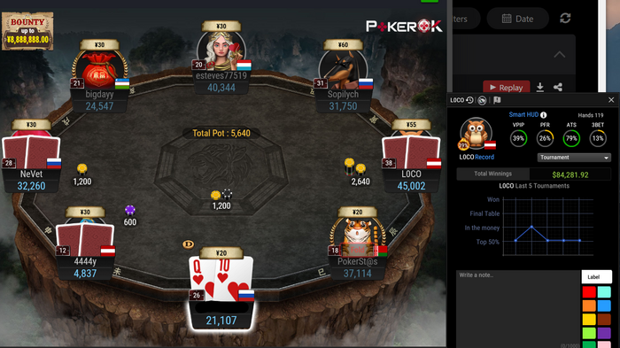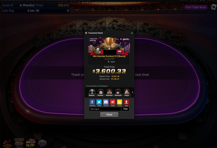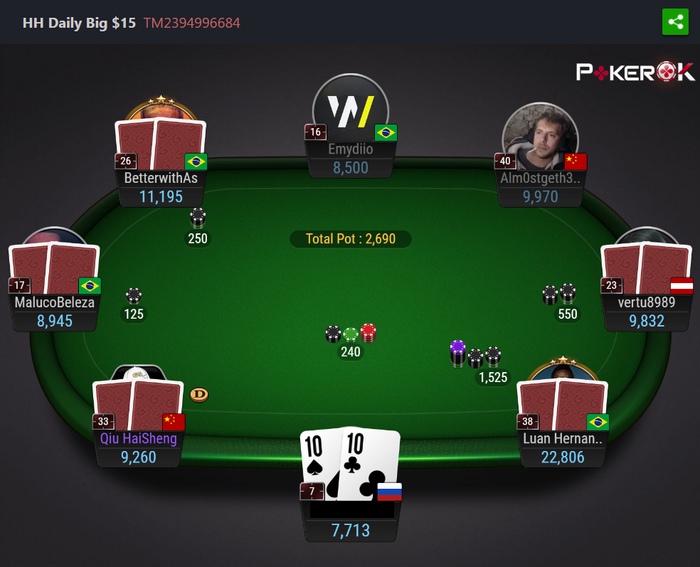 Сегодня сыграл всего 10 турниров. Последний был мистери баунти за 210, через сат за 8. В самом начале рег блефанул в сквизпоте на терне и удвоил меня. Но в итоге вылетел где-то в середине.