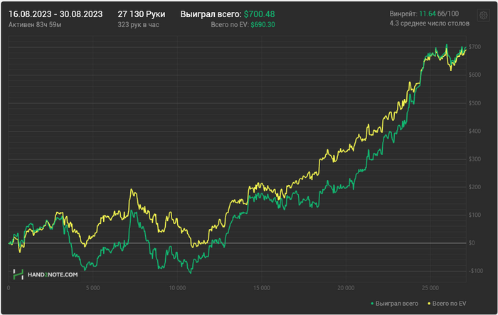 Сейчас играю 100-400, иногда 60, в основном 100-200, рук пока мало график позже выложу.