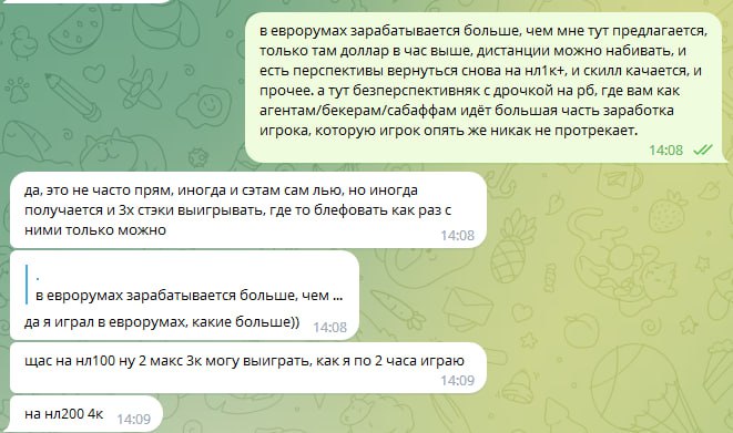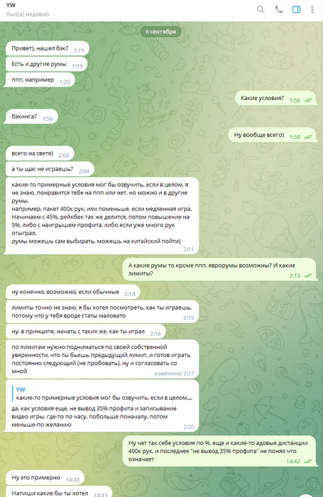 Рум этот якобы "совершенно секретный", и доступ к этому руму есть только у его друга "Соряна Багдасаряна", причём якобы с самыми лучшими условиями, доступа к такой катке нет ни у кого в снг, якобы это самая прибыльная и лёгкая игра в интернете на сегодняшний день. Это естественно ложь, 1 известный топ рег в комьюнити играл в этом руме/в этой сети ранее, толи в том году, толи несколько лет ранее. И естественно вердикт этого топ рега об этом руме оставляет желать лучшего. В данный момент этот человек не в сети, не могу сейчас с ним связаться, но думаю что он без проблем отпишется здесь позже при необходимости.
