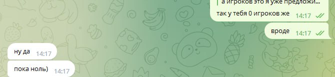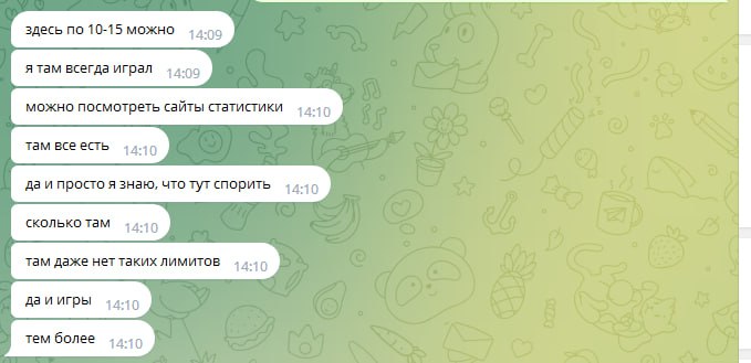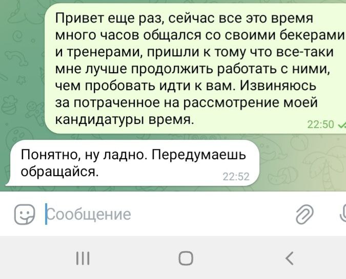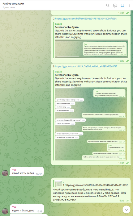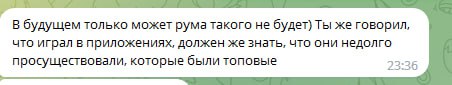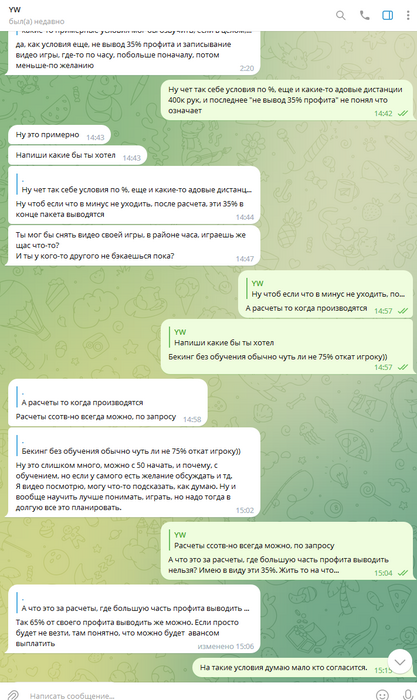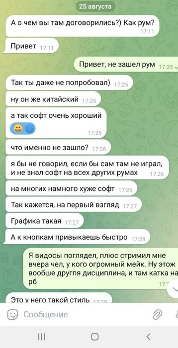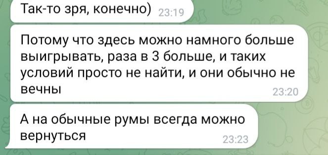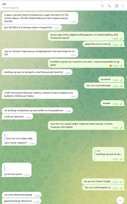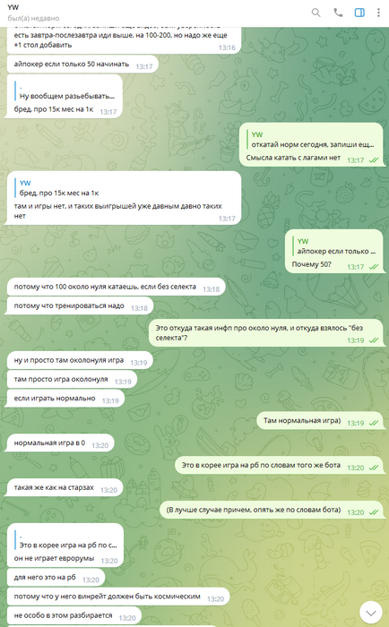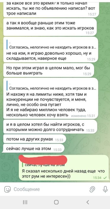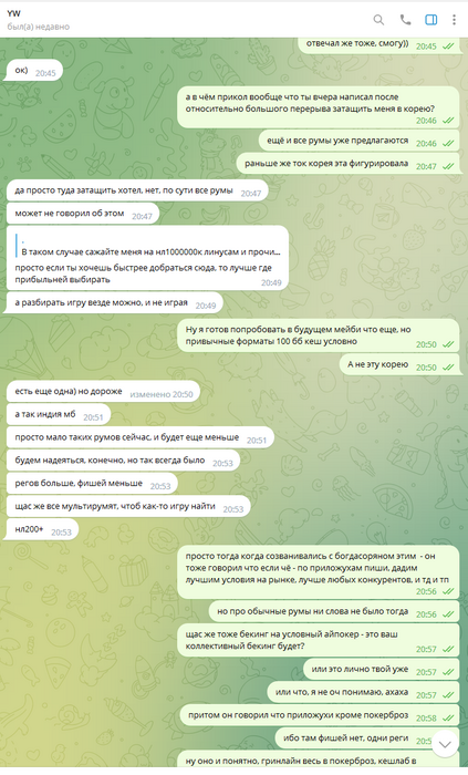 Около недели каждый день по множеству часов (!!!) Олег очень упорно уговаривал меня играть на бекинге в этом корейском руме. Притом что сразу же получил от меня ответ, что мне это не интересно, буквально в первый же день, первым же сообщением. Доходило до смешного, там были сотни сообщений реально каждый божий день, Олег уговаривал меня играть в этой корее, будто я последний человек на планете земля, день за днём получая отказы. Позже выяснилось, что от Олега и вовсе никто никогда не играл на этой корее, видимо поэтому он так долго и упорно пытался сделать меня первопроходцем))) К слову тому самому топ регу, что я упоминал выше (что играл ранее на этой корее)- я посылал отдельные самые рофельные скриншоты этих бесконечных попыток Олега уговорить меня играть на корее день за днём. Ну просто невозможно было не поделиться такой степенью шизофрении Олега, как можно ТАК НАСТОЙЧИВО предлагать изо дня в день эту корею, когда тебе раз за разом культурно, а потом уже и менее культурно говорят отказывают :)))))))))))))