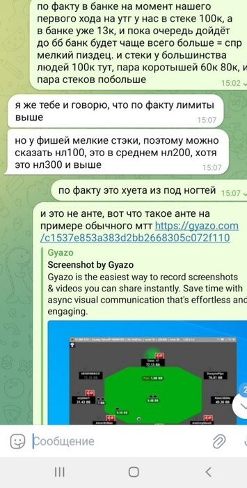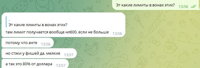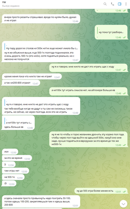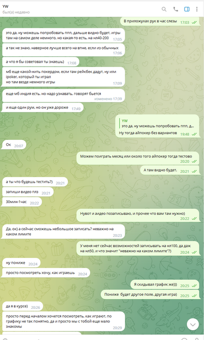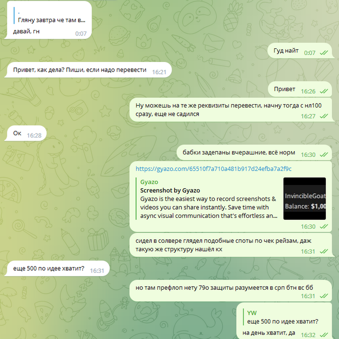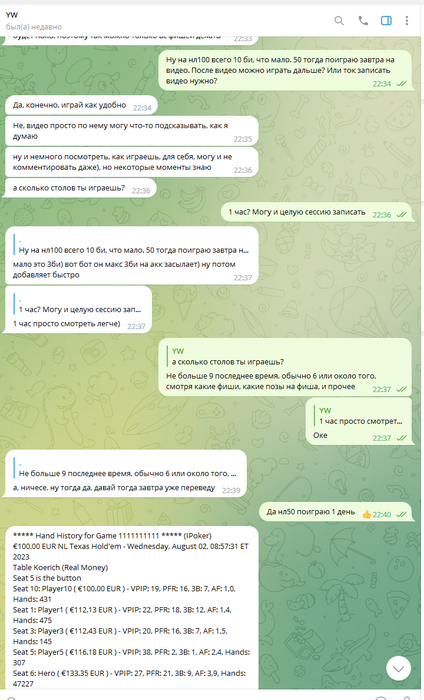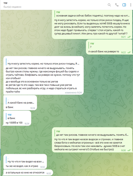 Олег скидывает 1000$, ранее обсуждали что играть буду нл50-100 на старте, в будущем будем подниматься по лимитам. После получения первого транша от Олега спрашиваю его - какие лимиты мне играть? После его ответов пишу сам о том что стартую тогда с нл50, так как полученных денег мало для нл100 евро айпокера.