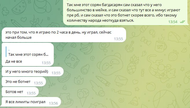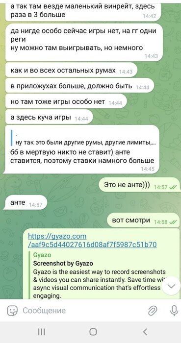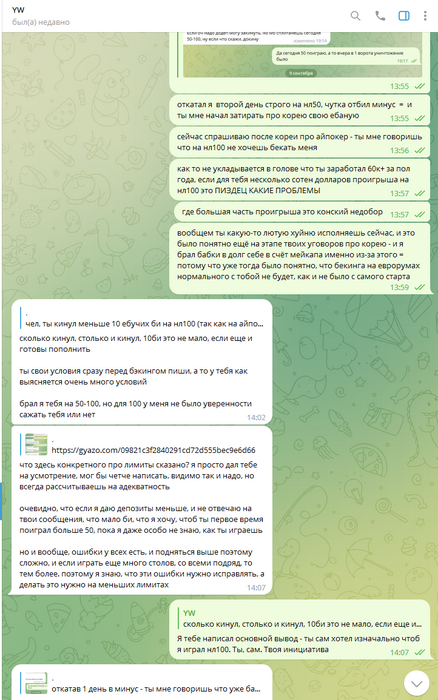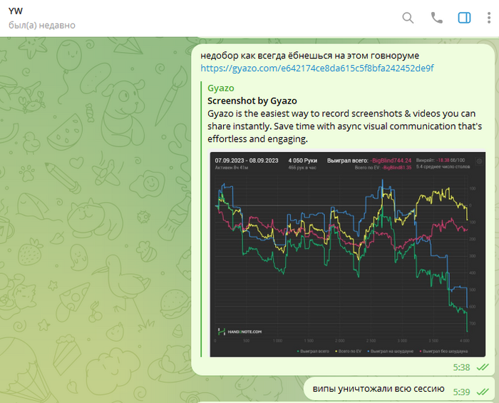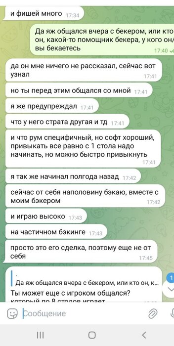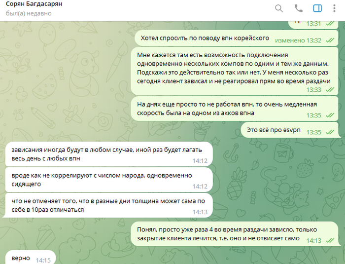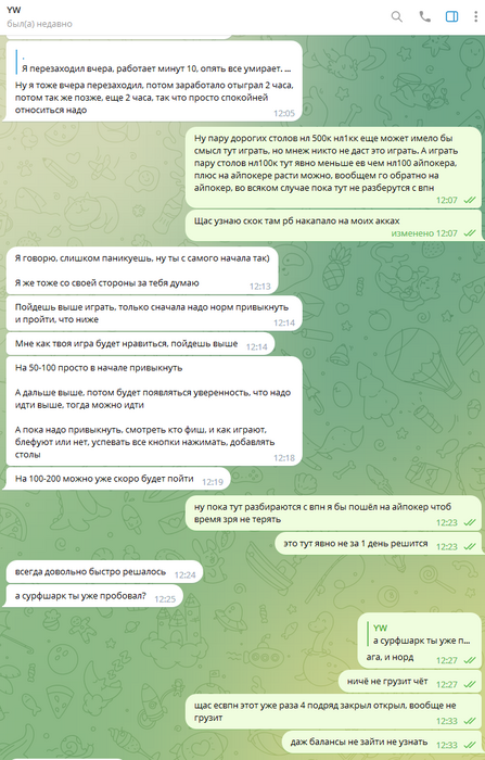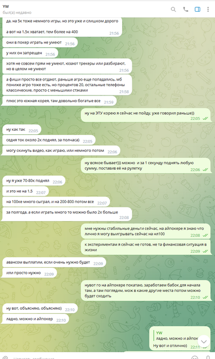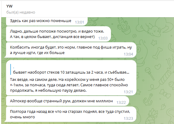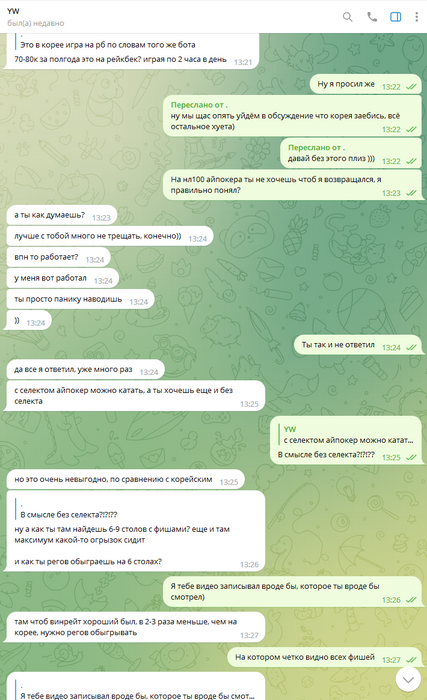 Следует добавить что игра в данном руме идёт через корейские впн, которые предоставлял бекер "Сорян Багдасарян". И эти впн постоянно не работали, или работали с дикими лагами. Здесь важно отметить что при входе в "рум"/приложение - на компьютере полностью отрубается интернет абсолютно везде, кроме этих приложений. То есть не работает браузер, телега, и тд и тп. Самое главное - тебя может выкинуть прямо посреди игры за столом, в том числе в дорогом банке. А таймбанки там 6секунд, авточеков нет. То есть ты очень часто теряешь деньги, и играть в таких условиях просто минус ев. Такое случалось несколько дней подряд, несколько раз. Олег говорил что такое появилось впервые буквально с моим приходом, его слова противоречили словам Соряна Багдасаряна, попросту Олег врал в очередной раз, ведь "главный" бекер говорил мне совсем другие вещи.