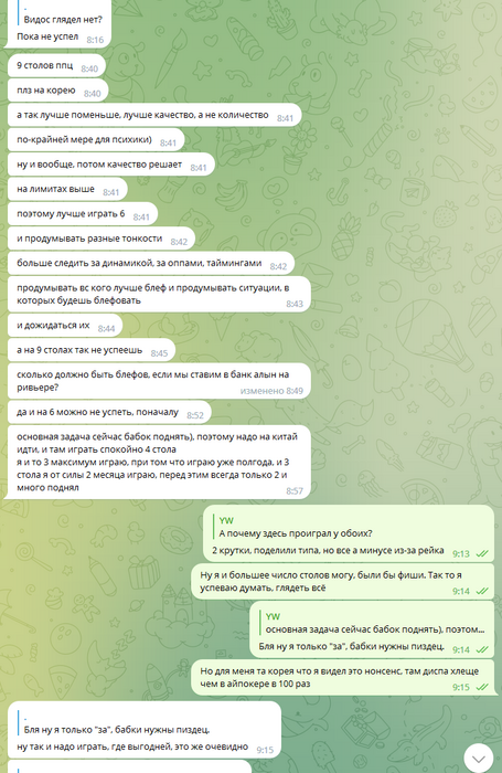 После этих двух сессий бекинг на айпокере закончился, фактический минус 420 долларов, с конским недобором, часть которого я отыграл во второй сессии на нл50. Ведь Олег после просмотра моей лайв сессии, записанной по его просьбе - снова начинает бесконечно говорить о корее, прямо настаивает, культурно настаивает чтобы я шёл играть корею, там я заработаю кучу денег.