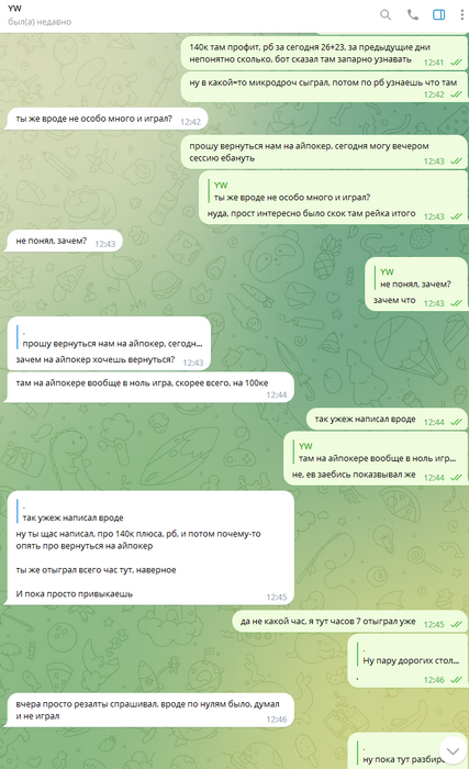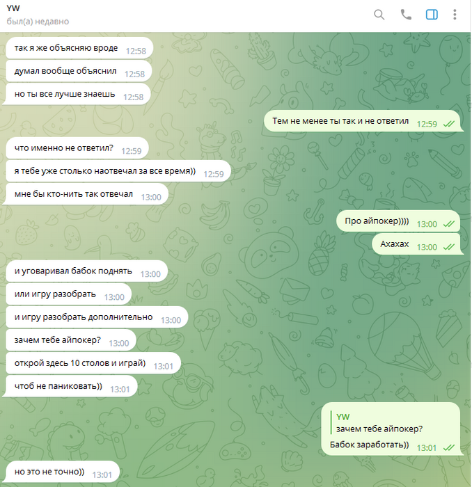 Позже таки приходим к тому чтобы я поиграл айпокер. Олег правда всё равно пытается заставить меня играть в корее, постоянно меняются суммы его выгрышей за пол года - то 60к, то 70к, то 80к.