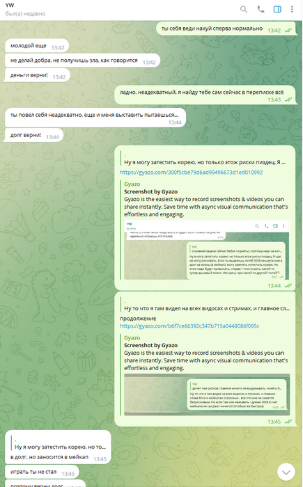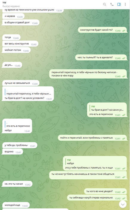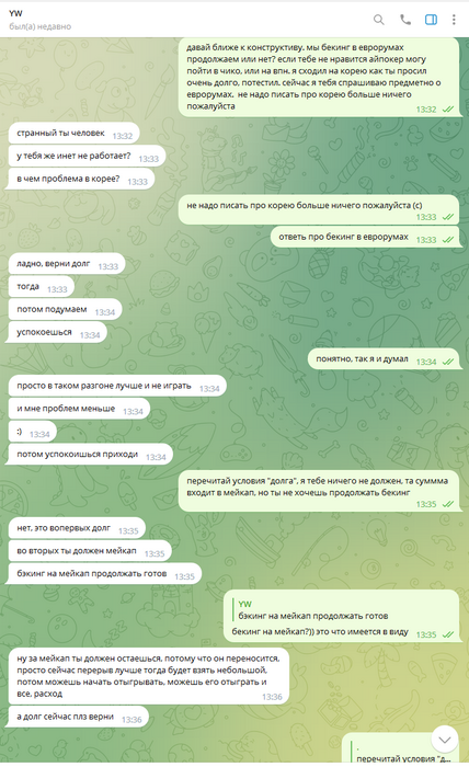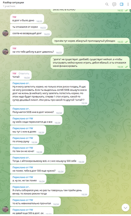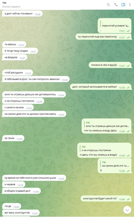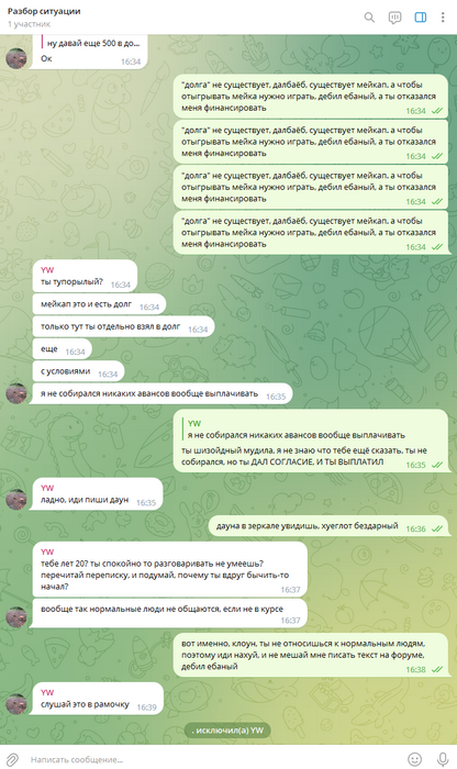 Далее, его нормально пытались от этого отговорить, но он зачем-то начал себя вести неадекватно. После чего, я попросил его тогда вернуть долг, который ему был выплачен авансом. На что он начал еще больше себя вести неадекватно, и говорит, что это не долг, а мейкап, который теперь он должен отыгрывать. Но он сам попросил эти деньги, в долг, с условиями перехода в другой рум, и ест-но этот долг записывается в мейкап, в счет будущих выигрышей, куда ему еще собственно записываться.