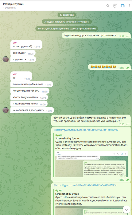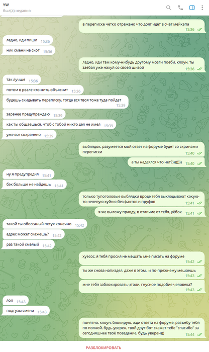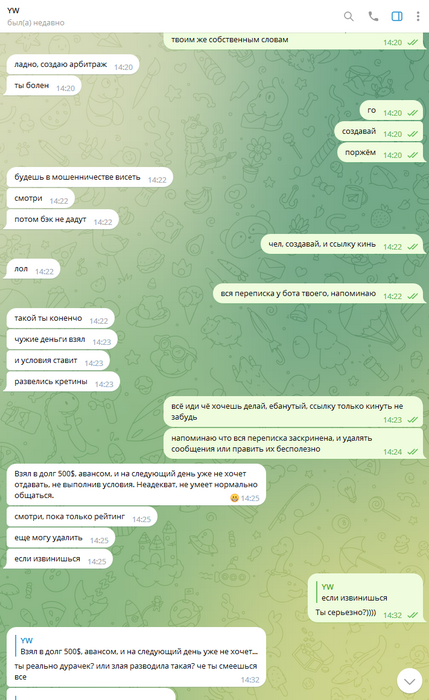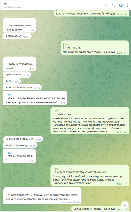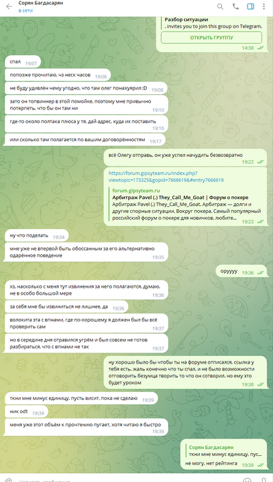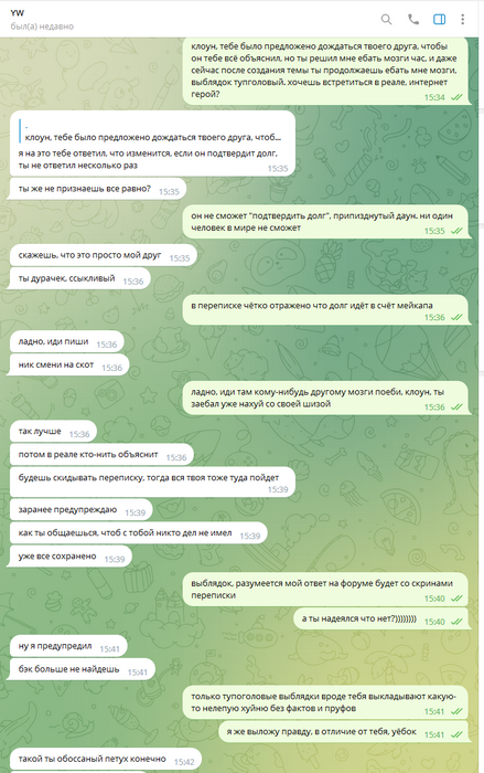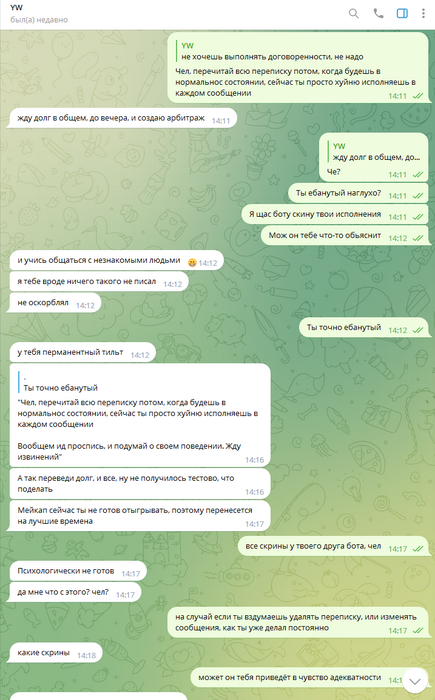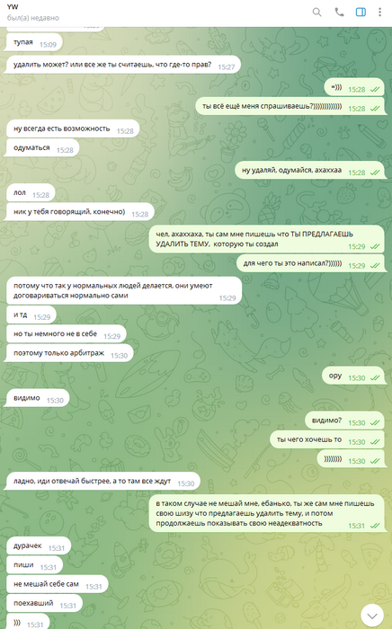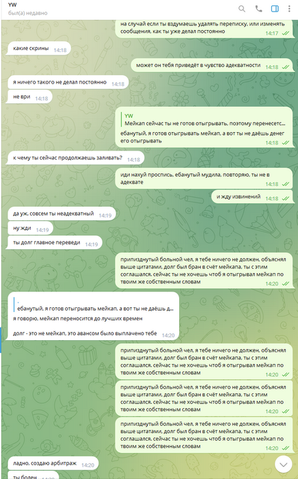 Дальше уже общаться адекватно было невозможно, всё скатилось в какой-то лютейший пиздец, в угрозы создания арбитража, при этом арбитраж так и не создавался, Олег ебал мне мозги, потом таки создал арбитраж, и ещё неоднократно предлагал удалить арбитраж, постоянно вынося мозг мне раз за разом. Он даже не остановился, когда я отправил в чс, и просил дать мне ответить ему на форуме, раз уж он так хочет.
