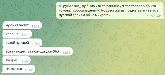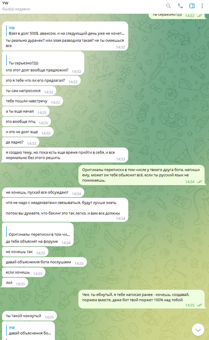 kerzh, ты это кому? тут дело не только в 500 долларах, еще и времени было на него много потрачено, но в целом, больше в них. Сейчас чел просто решил посраться, и еще закрысить бабки попутно, может он их уже проиграл, поэтому так себя ведет, я не знаю, и пытается еще меня как-то обосрать и в чем-то обвинить...
