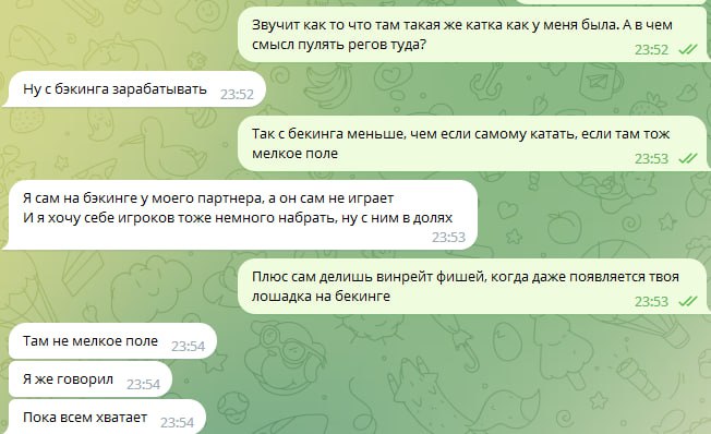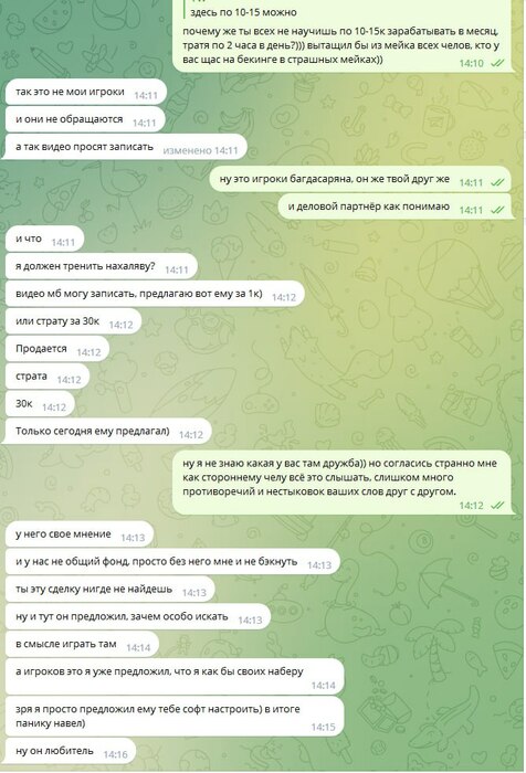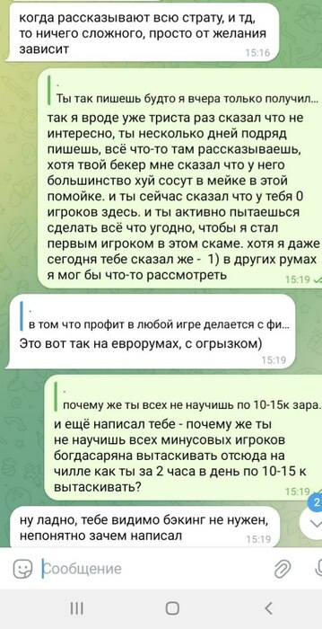 Более того я задавал Олегу резонный и очевидный вопрос - в чём прикол бекать сюда игроков, если можно самому зарабатывать огромные деньги, "уделяя этому всего лишь пару часов в день". И поляна же ведь должна быть узкая, зачем вообще сюда пихать новых регов. Олег же ответил что фишей тут миллиард, хватит на всех, и он хочет подзаработать, ведь он якобы хочет частично бекать меня в долях со своим другом "Соряном Багдасаряном".