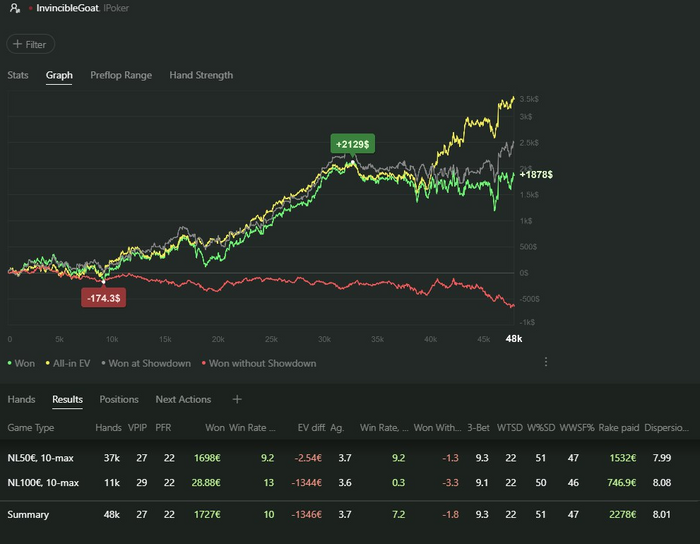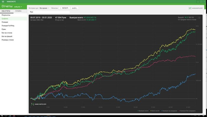 Отыгрываю первую сессию на нл100. Посылаю Олегу график, баланс в руме, споты, обсуждаем раздачи.