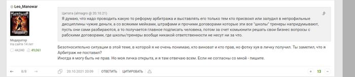 Итак, возвращаемся в 2021 год к теме https://forum.gipsyteam.ru/index.php?viewtopic=164303 , в которой мне поставили арбитраж уже после моего "последнего сообщения с аккаунта slimka" на форуме. Самое главное здесь в том что по ходу развития событий на тот момент на протяжении всей темы арбитраж мне не ставили, более того даже после моего последнего сообщения на форуме был очень интересный пост алкоголика лёньки мановара - https://gyazo.com/759accdabb612103a095719d8a6e6e02 , где чёрным по белому написано что арбитраж мне ставить не за что. Однако в дальнейшем арбитраж мне влепили, причём без обоснований. Более того наш алкаш лёнька мановар не отвечал даже в личке.