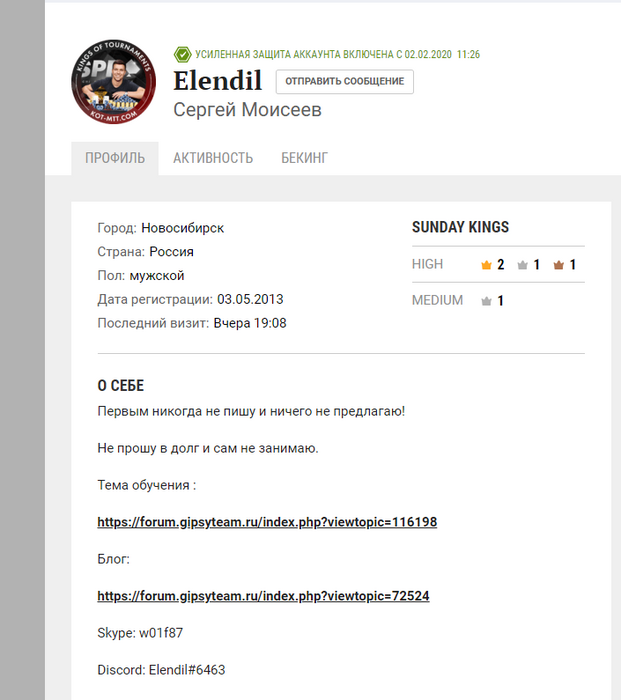 По хронологии дальше я был в нескольких маленьких фондах, в том числе имел "удовольствие" попасть в скам от https://www.gipsyteam.ru/profile/elendil , что числится в тренерах во многих фондах, главным образом в КОТ-ах. Сергей сотрудничал с одним фондом, был там главным тренером, возможно и инвестором. Там предоставлялась мтт игра в маленьких закрытых итальяснких резервациях, были различные румы, аля итальянский айпокер, пиплс, что-то ещё. Это очень маленькие поля с низким афс, и самое главное - ТАМ НУЖНО БЫЛО ТИМПЛЕИТЬ вместе с немногочисленными участниками этого фонда играя в созвонах, попутно играя в этих маленьких турнирах одновременно с множества аккаунтов самому. То есть ты сам сидишь в одном и том же турнире условно с 5 акков, и часто играешь сам с собой за одним столом. От такого мероприятия я конечо же отказался, хотел собрать пруфы и выложить арбитражную тему со всем этим скамом, но меня быстренько пульнули с дискорда, а Сергей лишь сказал что "он всего лишь тут тренер, и вообще что тебе не нравится, участники игры не рискуют своими деньгами, скама нет".