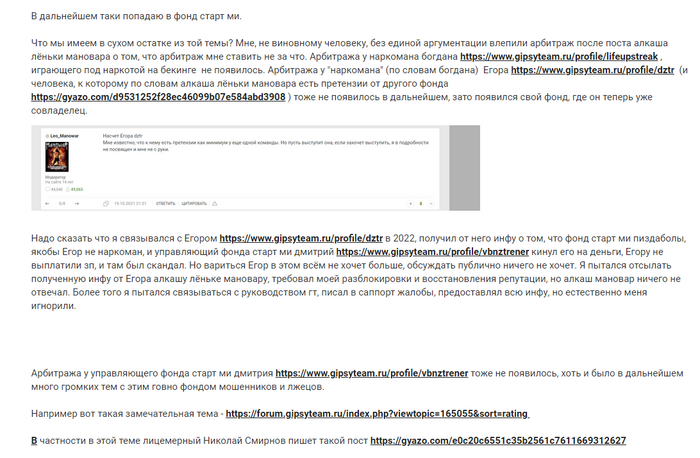 Надо сказать что я связывался с Егором https://www.gipsyteam.ru/profile/dztr в 2022, получил от него инфу о том, что фонд старт ми пиздаболы, якобы Егор не наркоман, и управляющий фонда старт ми дмитрий https://www.gipsyteam.ru/profile/vbnztrener кинул его на деньги, Егору не выплатили зп, и там был скандал. Но вариться Егор в этом всём не хочет больше, обсуждать публично ничего не хочет. Я пытался отсылать полученную инфу от Егора алкашу лёньке мановару, требовал моей разблокировки и восстановления репутации, но алкаш мановар ничего не отвечал. Более того я пытался связываться с руководством гт, писал в саппорт жалобы, предоставлял всю инфу, но естественно меня игнорили.