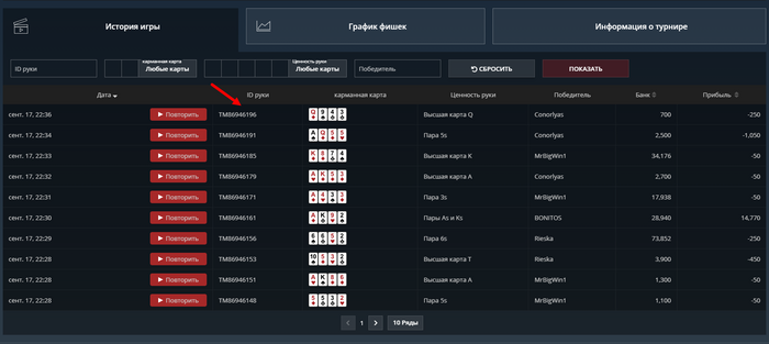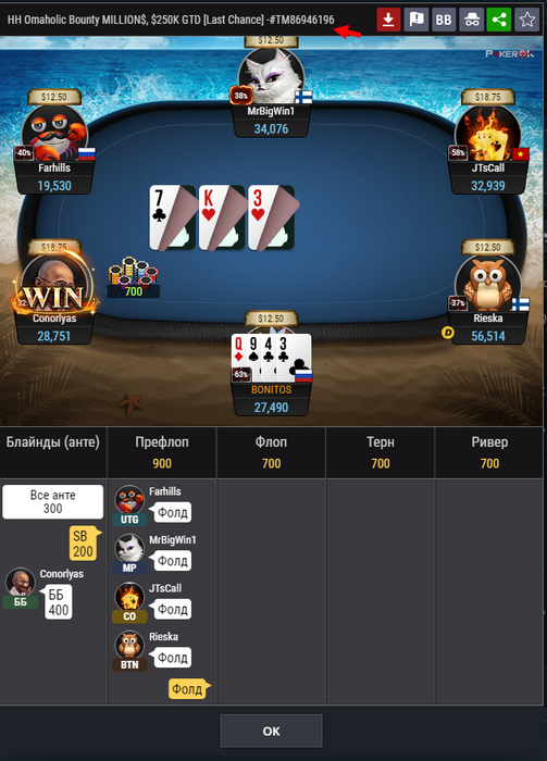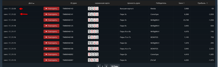 С другим турниром аналогично, но в покеркрафт не сохранились последние раздачи с удвоением, но я успел сделать скрин.