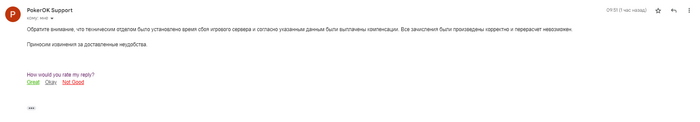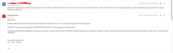 Ситуация не из самых приятных и просто хотелось бы понять, они пишут про то что тех.отделом было установлено время сбоя, где оно прописано? Даже, если допустим сбой произошел в 22:21 по мск и дальнейшие движения в турнирах при разлаге (вылеты, удвоения, проигрыш/увеличение части стека) не имеют значения, я как игрок столкнувшись с данной ситуацией впервые, не знал как действовать и продолжал ждать, а когда разлагало играл оптимально. Не хочется мелочиться, но где какая-то лояльность к клиенту, получаю половину баина омахи по итогу, при этом ознакомился с веткой покерка, другие коллеги не жалуются, компенсацией довольны в большинстве своём.