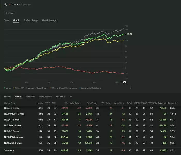 Здесь я буду вместе с вами исследовать увлекательный мир техасского безлимитного, анализировать ГТО страты, тактики игры, делиться своими успехами и неудачами за покерным столом. Планирую регулярно выкладывать интересные, прикольные, серьёзные раздачи. Кроме того, каждую неделю я буду представлять вам подробные отчеты о своих покерных сессиях. Вы увидите мои результаты за неделю. Будем вместе ̶а̶у̶т̶и̶р̶о̶в̶а̶т̶ь̶ анализировать эти данные и стремиться стать лучшими игроками. Ведь благодаря обмену опытом и идеями мы сможем улучшить свою игру и достичь новых высот.