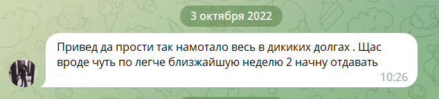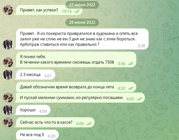 Проигранный бэкинг, долг признаёт, не возвращает больше года.