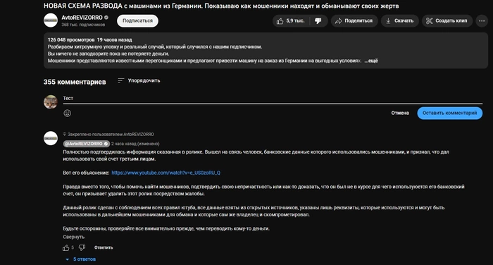 После того, как в комменты в канал Авторевизорро пришли люди с вопросами, проверял ли он вообще факт кидка, тот забанил сначала вопрошавших, а потом и вообще закрыл комментарии на всём канале разом.