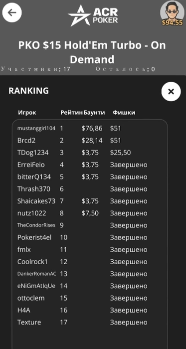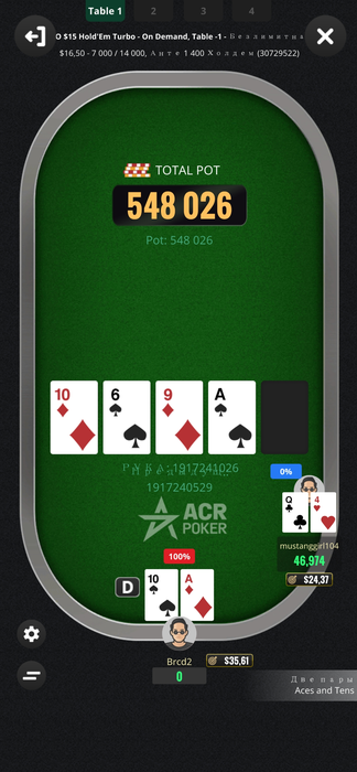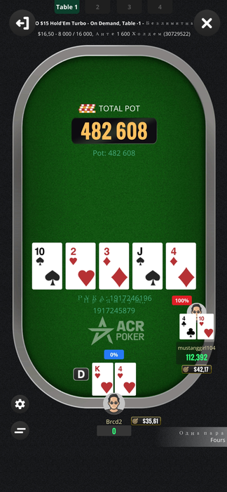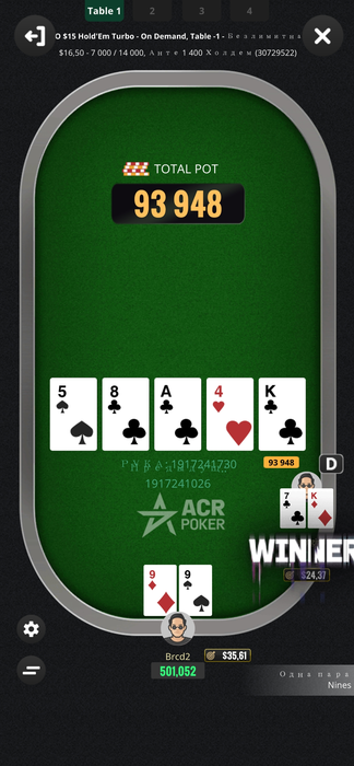 Оппонент начинает олл-инить, потом Я понимаю что он всё! Олл-инит, пре-флоп,подумал или боится меня что Я разрывал так всëх и набил стек, или такая стратегия, или спешит, но нет - пробовал тянуть время - до лампочки, один раз он фолд сделал вроде и всё, остальное олл-ин преф-лоп каждую руку,15-20 рук мы сыграли, стек норм мне так поджырал, а Я просто так в олл-ин не пойду, потом после турнира Я догадался что так как за 1-2 место было поровну по 51$ он так может ии подумал что уже всё, но ведь такая же сумма должна была ещё выпасть победителю за нокаут и свою голову,