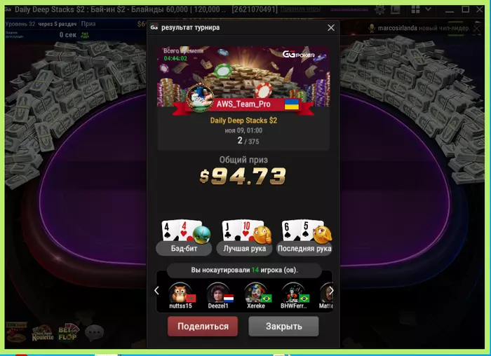 Кстати вчера была моя 1 финалка в МТТ. Не справившись со своим внутреннем беспокойством и усталостью мисс клик который привёл меня к All-in 65s vs AA с флопа он получил фулл-хаус. Оппонент агрил меня постоянно в позиции и без любое моё действие постоянная агрессия. Как итог я занял 2 место в Deep Stack за 2$. и заработал 94$ с копейками.