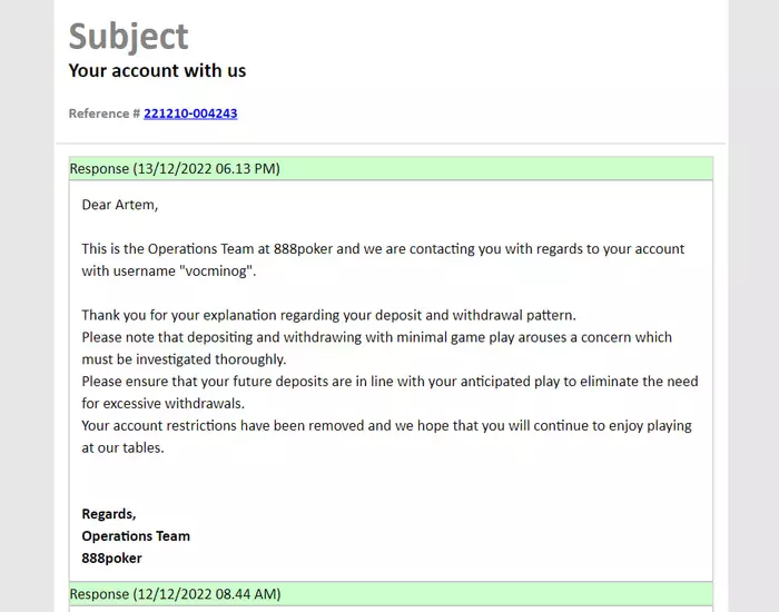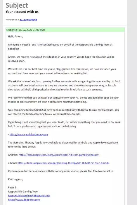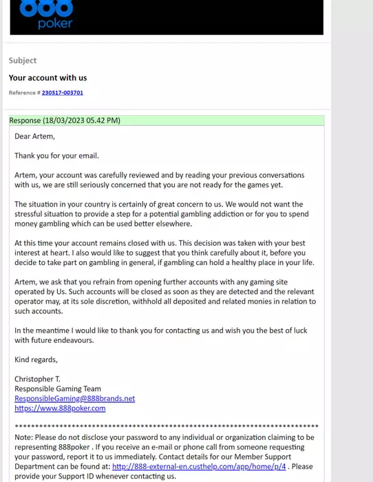 Об ситуации: больше года назад, я завел деньги на 888ки. Сыграл буквально несколько сессий( где-то парочка турниров), после чего начались перебои с электричеством и я перестал играть. Через некоторое время, я решил вывести деньги: поставил на вывод - получил письмо, что надо отыграть - ответил, что немогу играть т.к. перебои с электричеством - получил письмо, что выведут все мои деньги (было 6к+, вывели только 3к), но помимо письма, получил фриз акаунта на 888ках и бан моей почты, по причине : не стабильной ситуации в вашей стране. Писал им несколько раз с другой почты, т.к. мою они забанили, звонил в поддержку, на что ответ был один и тот же.