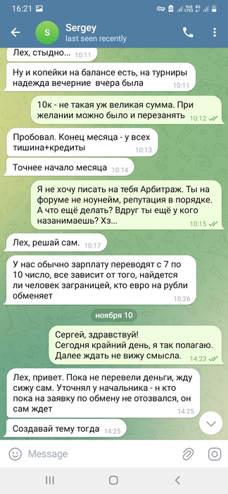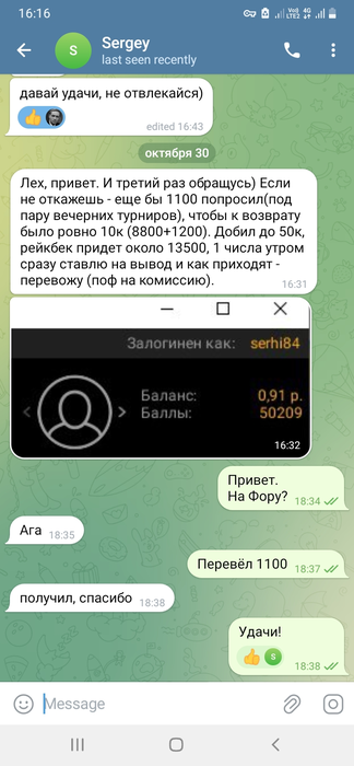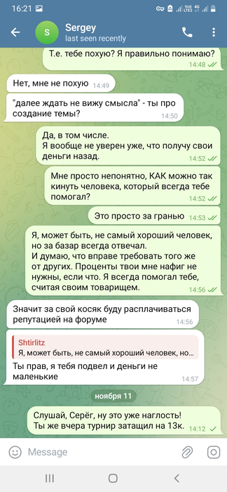 Еще раз хотел бы извиниться перед Алексеем. Подвел с возвратом 1 числа, не вывев кешбек (как и обещал). Зарплату задержали. Вчера не был в онлайне - не смог ответить в телеге. Понимаю, что со стороны это выглядит как нелепые отмазки, но всё же. Деньги переведены в полном объеме, как и было оговорено в переписке.