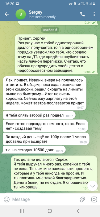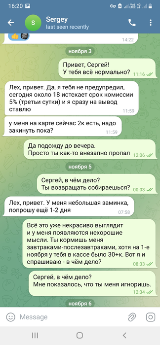 26-го октября Сергей попросил 5 000 рублей под 10%, я ему перевёл. Затем как у Винни Пуха "А потом ещё немножко, а потом ещё немножко..." В общей сложности 9 100 рублей, которые обещал вернуть 1-го ноября.