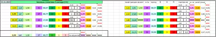 Сперва результаты материнских таблиц модуля С. Да, кстати, прежде чем. После проверенного задним числом части сезона 2021 года, где была оч сильная просадка как раз в начальных турах (речь идет о верхних таблицах, куда отбор производится кф рентабельности, исходя из проходимости после предыдущего тура), поэтому пришлось резко повышать играбельный кф в таблицах с плохой изначальной проходимостью до кф 2 и больше. Чтобы такого не повторялось и процент общей проходимости снижался более плавно, я решил изменить формулу дополнительного отсеивания по рентабельности ставки. Конечно нужен индивидуальный подход к каждой таблице, так как в части таблиц прогнозов за тур может быть в несколько раз больше чем у остальных. Поэтому исходя из проходимости разных диапазонов за 2022 сезон поставил такой шаблон отсеивания : дистанция от 0 до 11 матчей отбирается с кф от 1 до 2 / 11-21 = кф1-3 /