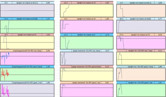 Результаты прошлого тура (09.02.2024.) и дистанции в целом. Сделал большие графики на каждую доп таблицу, так же вывел результаты по турам в каждой доп таблице модуля, в том числе и по общему нижнему архиву основных таблиц модулей, куда записываются все отобранные матчи с любым кф. Архивировать общие результаты верхних архивов таблиц, с дополнительным отбором в каждой из них кф рентабельности , исходя из проходимости и количества отобранных матчей в архиве пока хорошего способа (без бубна, из-за нехватки места в книге подсчета, т.к. простые связки ссылками влекут за собой определенные проблемы в будущем) не придумал.