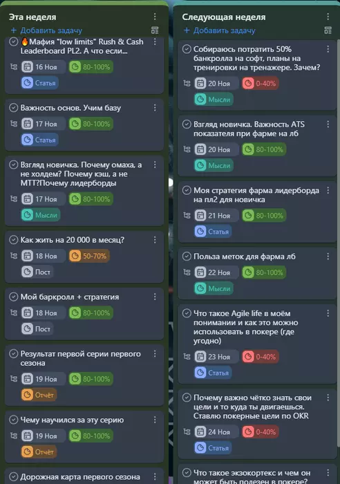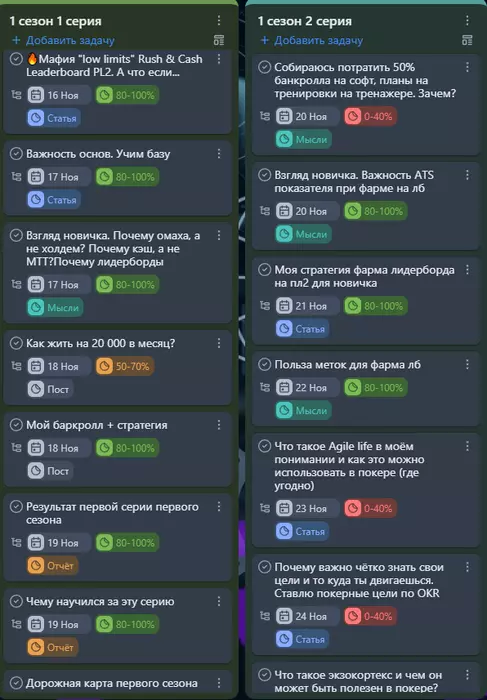 Пример расписания на первую и вторую серию второго сезона для данного дневника. Посвящен первый сезон руму покерок и тому как я щупаю самые маленькие лидерборды на пл2 (в конце сезона), а в начале первые серии будут о том, как я понимаю логику принятия правильных решений на префлопе и чуть чуть постфлопа (самую базу). Учусь оптимальной игре на префлопе с помощью тренажера (хочу довести до 90-95% точности правильных решений опенрейза на префлопе) для того, чтобы построить скелет игры и научиться играть в АБЦ покер в ТАГ стиле играя на микролимитных лидербордах, чтобы в будущем видеть и замечать неоптимальную игру оппонентов и использовать это против них на лимитах повыше.