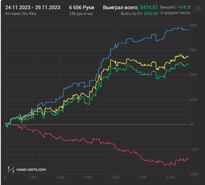Так вкратце о последнем покерном пути. Приблизительно в июне 2022 г. вступил в гринлайн отыграл 75к рук с вр около 6 бб\100, играл 60-100 (иногда подключал 200 под фиша) Поверив в свои силы решил уйти и катать от себя, но удалось с переменным успехом. Сильно тошнило от софта приложух и постоянного недобора, откатав ноябрь 2022г. +1.500$ по EV и 0 по факту, решил попробовать чико, катнул бестмонф в декабре 2022 + 2.600$ (нл50-100) и январь +1.900$ подумал вот она золотая жила, но следующие полгода как говорится вышел на свой реальный вр и за полгода плюсанул около 3к опять с недобором около 1.5к. На данный момент катаю только нл50 на старзах.