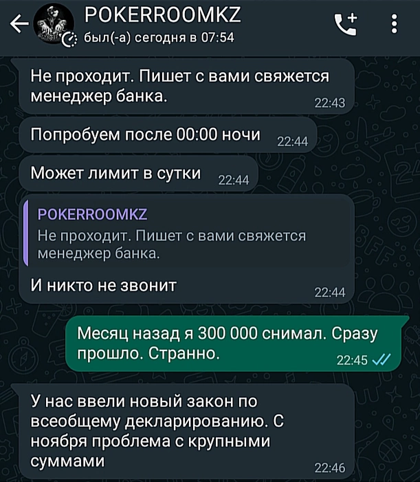 Здравствуйте. Хотел бы поделиться с тем, как казахстанский покерный рум POKERROOMKZ в приложении ClubGG, задерживают вывод денег. Я запросил снятие в позапрошлую пятницу и уже прошло более 10 дней. Первый раз когда я запросил, они написали что "все лимиты исчерпаны", и поэтому просили подождать до понедельника. В понедельник выясняется что есть проблема с переводом в иностранный банк из за необходимости декларирования. Но уточнив у Каспи банка я выяснил что при переводе на иностранный банк, декларация не требуется ( все скриншоты переписок прилагаю к сообщению) о чем и сообщил администратору рума. Он отреагировал агрессивно, и говорит давай не будем об одном и том же, хотя эту информацию Я ему сообщил впервые. В общем, он просил ожидать. Со своей стороны я предложил ему ещё 2 электронных кошелька куда можно сделать перевод мне с Каспи, на что он сказал что уточнит у кассира, но ответа я так и не получил. Дальнейшие мои запросы с уточнением сроков решения данного вопроса, он просто перестал читать. В итоге я вынужден это все озвучивать здесь, чтобы вы знали, что у них есть проблемы с выводом денег. Поскольку сумма немалая, то возможно они решили эти деньги оставить себе, придумав эту сказку с декларацией. Ведь сотрудник банка Каспи сказал что деклараций при переводе не требуется. И на мой запрос у администратора рума скинуть мне скриншот сообщения об ошибке перевода денег, он опять таки не скинул. На предоставление ему 2 других способа перевода, он не ответил. По срокам решения тоже. Налицо нежелание переводить запрашиваемые мной деньги. Если это сообщение как то их не вразумит, то я буду обращаться в надзорные органы Казахстана. Большая просьба поделиться этим сообщением с теми кто возможно играет в их покер руме, чтобы они знали, что когда игрок выходит в плюс, они могут не сделать перевод, придумав любое оправдание.