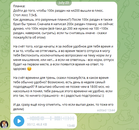 Условия, на которых мы договорились о тренировках за часть профита: