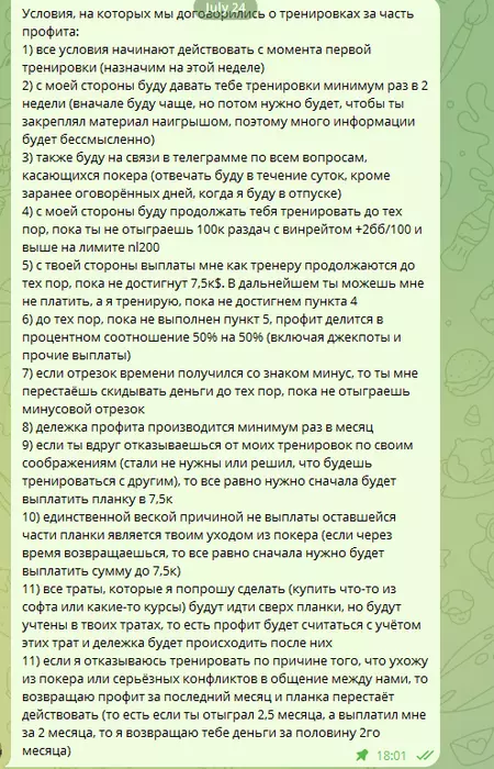 11) если я отказываюсь тренировать по причине того, что ухожу из покера или серьёзных конфликтов в общение между нами, то возвращаю профит за последний месяц и планка перестаёт действовать (то есть если ты отыграл 2,5 месяца, а выплатил мне за 2 месяца, то я возвращаю тебе деньги за половину 2го месяца)