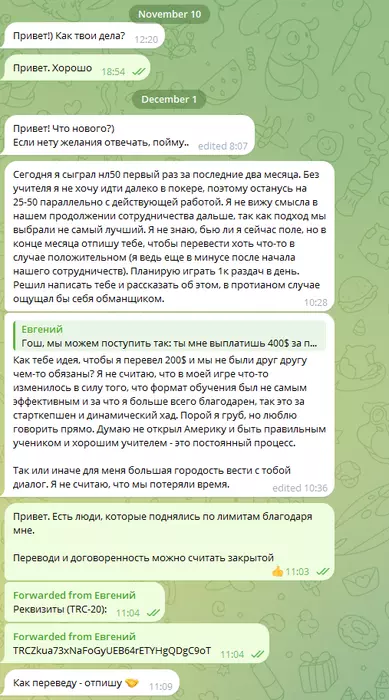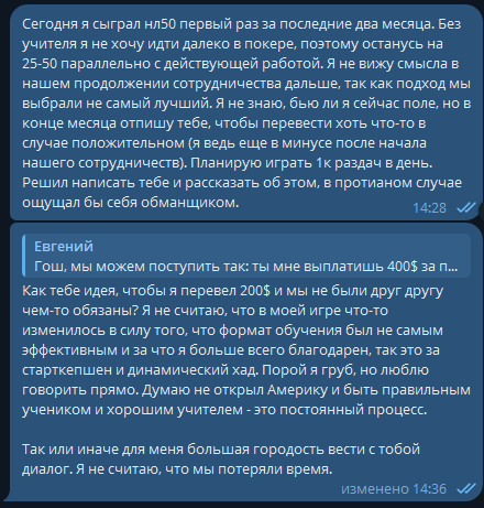 "Гош, мы можем поступить так: ты мне выплатишь 400$ за проведённые трени и ответы (что очень мало, информация больше стоит). И наша договорённость закончена (даже если ты вернёшься в покер завтра, я требовать ничего не буду)".