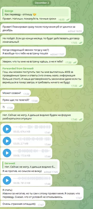 "с твоей стороны выплаты мне как тренеру продолжаются до тех пор, пока не достигнут 7,5к$. В дальнейшем ты можешь мне не платить, а я тренирую, пока не достигнем пункта 4". Вопрос к Жене, ты бы правда этого хотел? Если да, то давай продолжать, я же не против, просто выгоду не вижу для нас двоих. Когда я тебе задал вопрос о продолжении нашего сотрудничества ты не ответил. Я помню голосовое сообщение, где я на примере рассказал, что я честен с тобой (приводил пример низкой планки катки, чтобы платить меньше, мол я же мог и не говорить, если бы правда хотел это сделать).