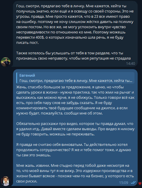 + учитывая, что я сейчас в -3к, то для Жени же было лучше принять моё предложение. Повторюсь, я в ведь не только о себе думал: если продолжать наши договоренности, то это включает в себя созвоны с Женей.