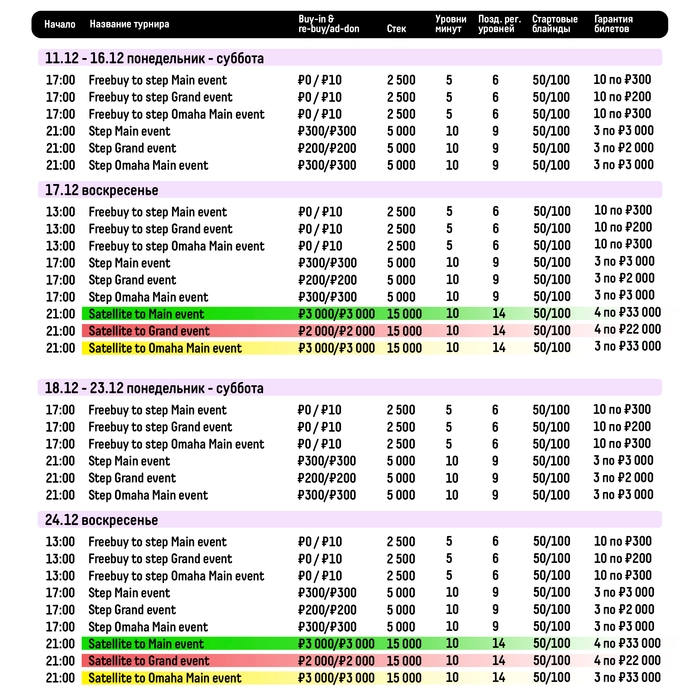С 11 по 24 декабря на PokerDom пройдет двухнедельная серия онлайн-сателлитов. Как и всегда начнем с фрибайев, продолжим степами и завершим все финальными сателлитами по воскресеньям. Гарантировано разыграем 22 билета в 3 ивента: Main event, Grand event и Omaha Main event. Но как показывает практика предыдущих серий, эти цифры будут как минимум вдвое больше. 😉
