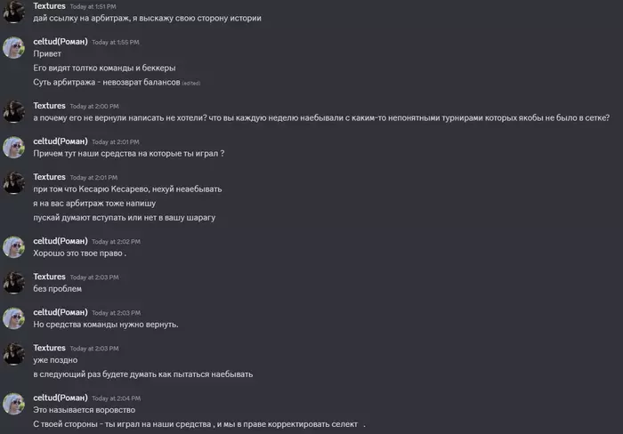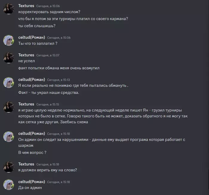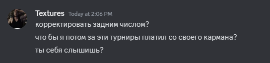 Textures, как владелец команды я не вижу никакого смысла заниматься какими-то схемами в формате штрафа игроков задним числом по выдуманному поводу. В отличие от персонажей вроде тебя, которые воруют деньги, не выполняют обязательства, забивают на дисциплину и сетку итд и затем, даже с наличием арбитража, иногда получают второй шанс, любой доказанный косяк подобного рода со стороны фонда хоронит его репутацию.