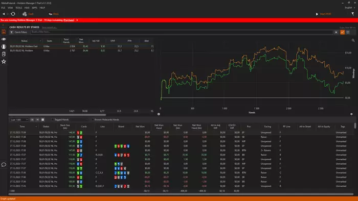 Вот такой текущий график на NL2 в какой то момент понял, что я ничего не понимаю и просто ушел в тильт, начал делать какие то необдуманные вещи. Сейчас пересматриваю раздачи и плачу. В здравом уме человек, который хоть малость умеет играть в покер не сделал бы такие мувы.