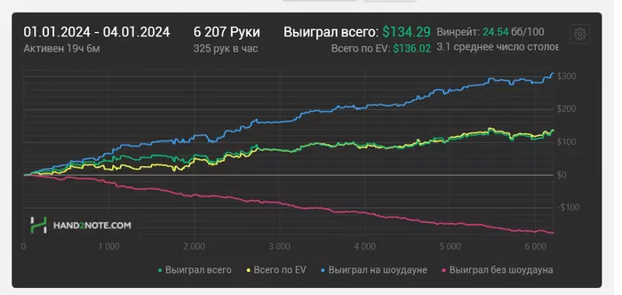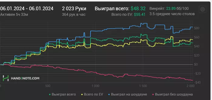 Обе цели (не уйти в минус и отыгрывать 2 к рук в день) выполнены. Посмотрим, что будет дальше. Первая сессия сегодня, 8-го января, отыграна в -25, увы. Вышла принудительно, не доиграв отведенный себе час. Надо переключиться, чтобы не начать тильтовать. Всем GG.
