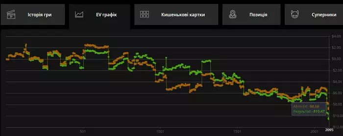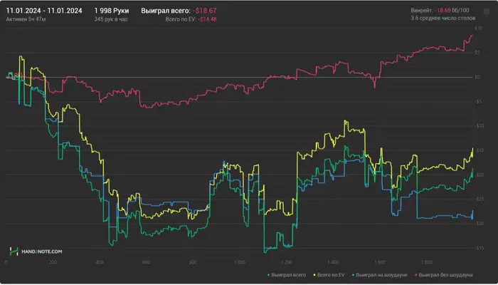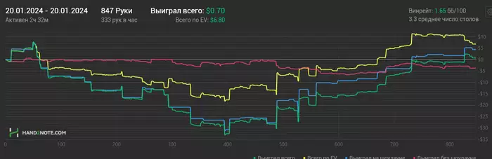 Сессия была очень трудной, я не мог сначала понять то ли я много ошибаюсь или словил какой то ран плохой. По итоге понял что было и то и то плюс упал в тильт. Не понимал как играть против оппов , если тебе не сдают а ты уже в замазке 5БИ, вот и начал чудить разную белеберду и заходил как фиш с любой рукой которая понтравилась чтоб наловить хоть что то , по итог еще -4БИ....