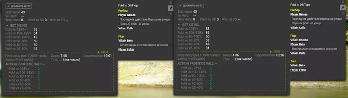 5. Очень высокие фолды на донки флопа и терна (видимо против нестандартных/редких линий боты прописаны не очень хорошо)
