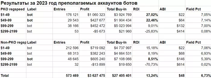 Что мы можем добавить к изложенным фактам? Пожалуй, самое основное - высказывавшаяся неоднократно в обсуждении мысль о том, что "если ботов не получится забанить, мы будем безжалостно их эксплоитить" очень плохо коррелирует с реальностью. Основное велью они получают от игры против любителей и слабых регов, не способных подстраиваться и выходить за рамки дефолтной игры. Да и если очень стараться, то за фулл ринг столом, с учетом ICM и других игроков за спиной, получить занчимый с точки зрения влияния на их ROI перевес над этими игроками практически невозможно. Кроме того, немалую часть преимущества составляют объективные факторы - боты (по нашему мнению они могут быть не полностью автоматические, а работать с помощью оператора) не устают, не волнуются и как следствие не допускают свойственных обычным людям ошибок в поздних стадиях турниров. Так что повторим вновь - чтобы решить проблему ботов, их нужно банить, все остальное крайне мало повлияет на ситуацию. Текущие показатели ROI ботов во многих из рассмотренных сегментов турниров находятся на уровне, а иногда и превышают показатели даже самых лучших регуляров соответствующих лимитов. Такие случаи в таблице выделены жирным шрифтом. Считаем, что в интересах всего комьюнити добиться от сети WPN признания факта существования проблемы и принятия всех мер для защиты честных игроков.