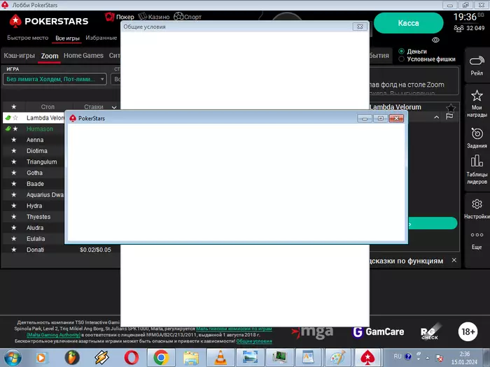 На компе 7ая винда,не заходил в клиент несколько лет,после ввода логина и пароля,появляется два окна "Pokerstars" и "Общие условия",которые сколько не жди не прогружаются. Комп в это время не виснет.Первое без проблем закрывается,при закрытии окна "Общие условия" клиент закрывается тоже. Никакие кнопки в клиенте в это время нажать нельзя. Как решить ?