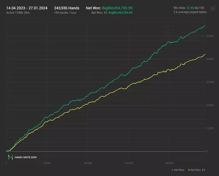 С 2020-ого до ноября 2022-ого года катал кеш, дошел до нл100, но в целом за это время начал понимать, что удовольствия от этого становится все меньше, и смысла развиваться особо не видел на тот момент, так что попробовав себя в проганье, и поняв, что это не мое было принято решение вернуться в покер, но в мтт. И наверное это было лучшим моим решением)