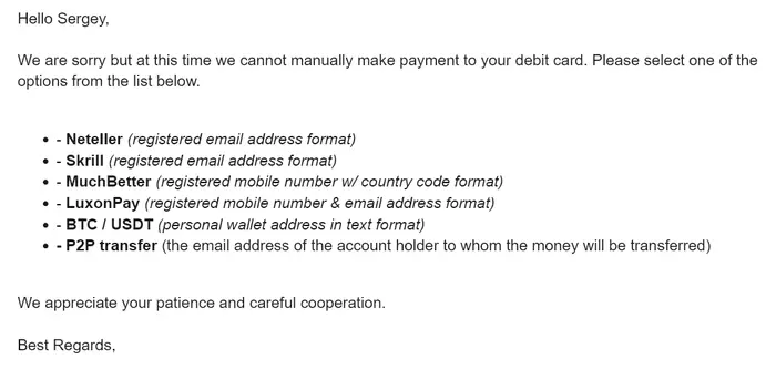 В последней строке они писанулись вернуть оставшийся баланс на ту карту, с которой делал депозит, но в итоге и от этих слов отказались.